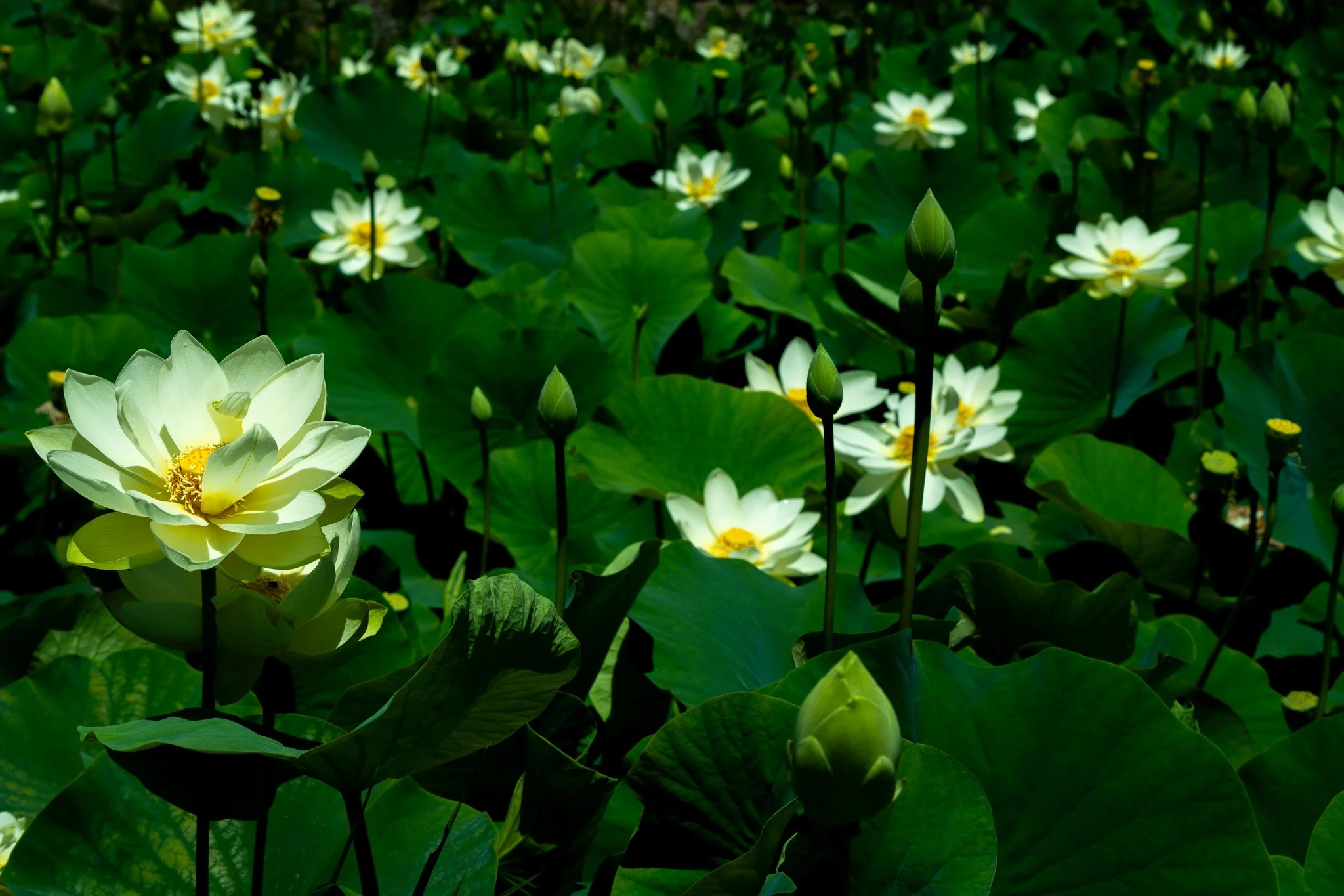 The blossoms were at every stage — tight buds, half-open spirals, and full blooms stretched wide to the sun. Standing so near, the scale of the leaves became strikingly clear. Some were as wide as serving platters, their surfaces catching droplets that rolled like quicksilver across their waxy skin.
