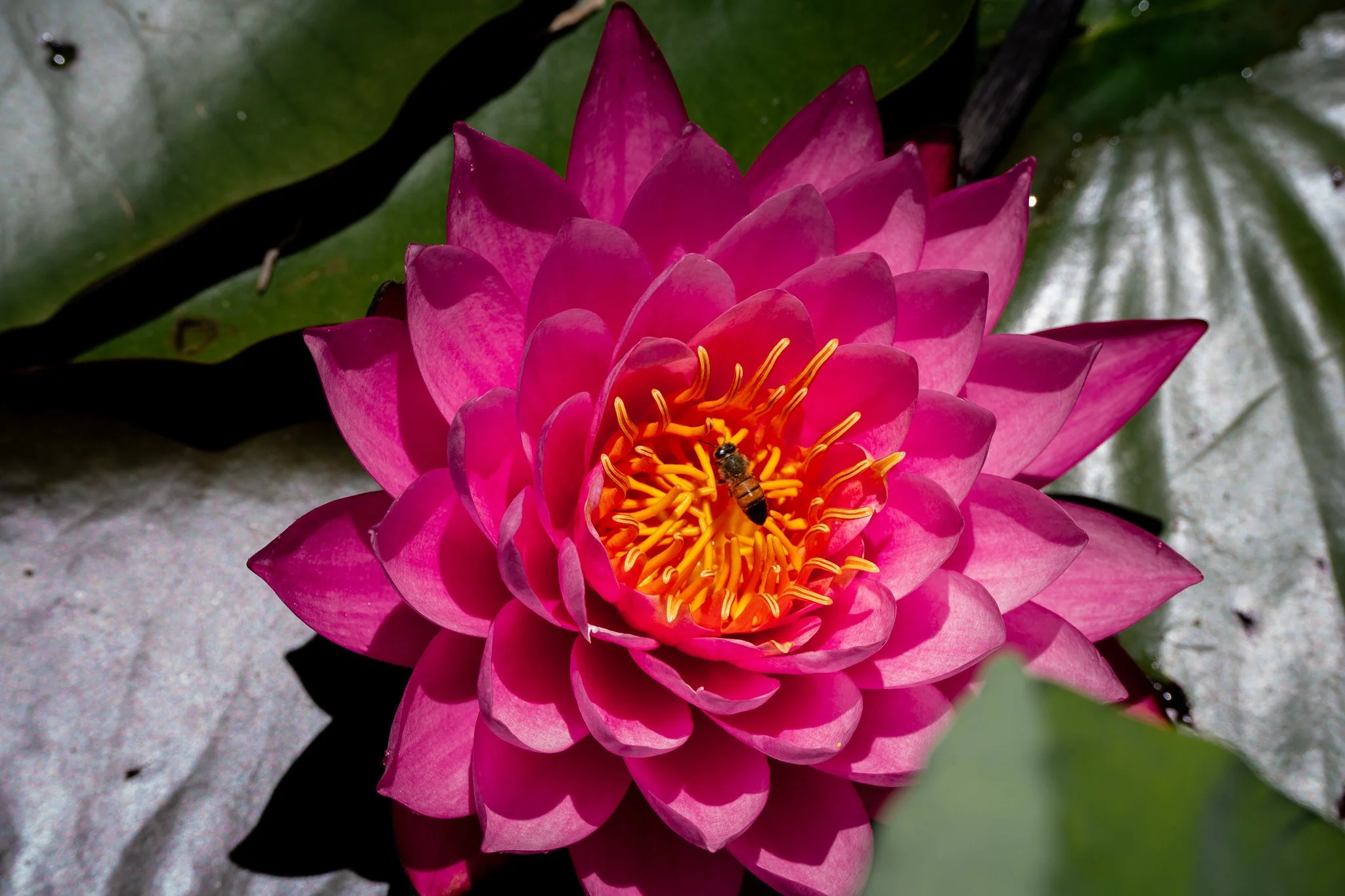 From the centre, the view unfolded differently — a vast landscape of leaves and blossoms stretching outward. Colours appeared more intense under the midday sun, reflections shimmering between stems.